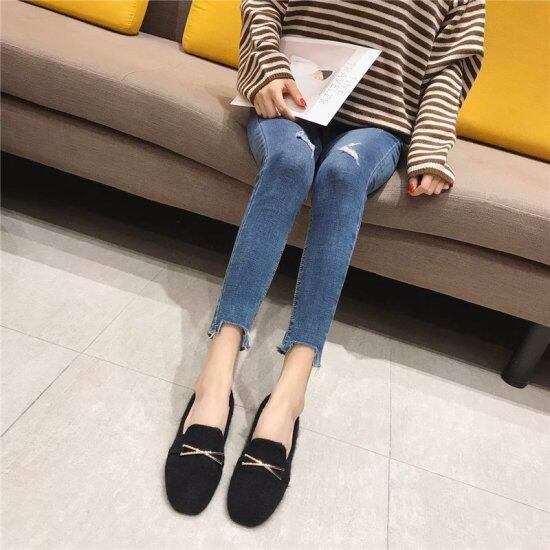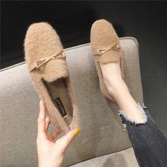 ワンポイントがかわいい毛足の短いファーのフラットシューズ。