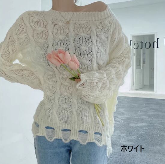 ニットセーター レディース トップス ニット セーター プルオーバー 長袖 ラウンドネック ケーブル編み ゆったり ルーズ カジュアル お出かけ おしゃれ 個性的 ファッション 女性 穴あきニット