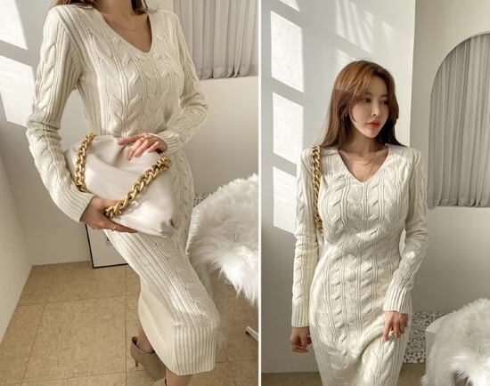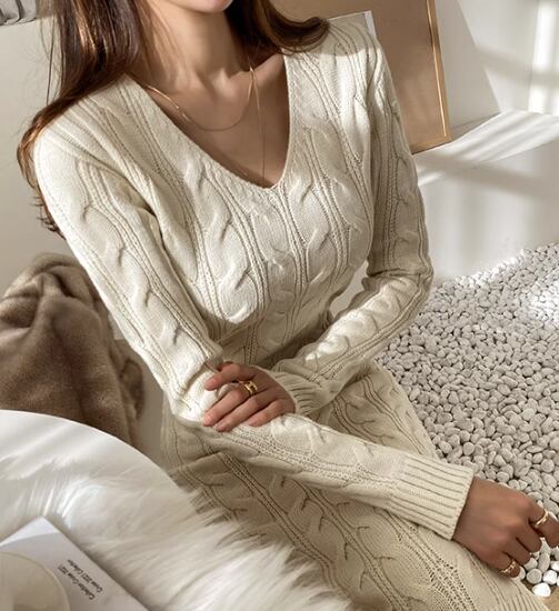 ニットワンピース レディース ワンピース ミドル丈ワンピース ニットワンピ ケーブル編み Vネック スリムフィット タイトワンピース カジュアル お出かけ おしゃれ きれいめ ハイウエスト 女性