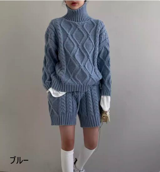 ニットセットアップ レディース ツーピース 2点セット 上下セット トップス ニット セーター タートルネック ケーブル編み 長袖 ボトムス ショートパンツ カジュアル お出かけ おしゃれ 秋冬