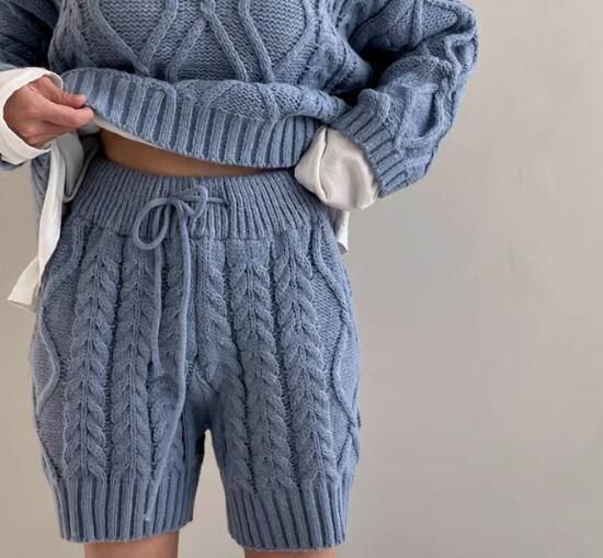 レトロな雰囲気のケーブル編みニットセットアップ。