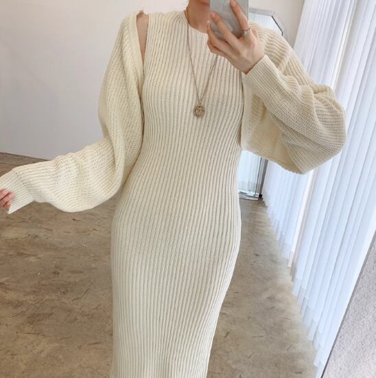 ニットセットアップ レディース 2点セット ツーピース ノースリーブワンピース ロングワンピース スリムフィット カーディガン ショール 羽織 リブニット カジュアル お出かけ おしゃれ シンプル