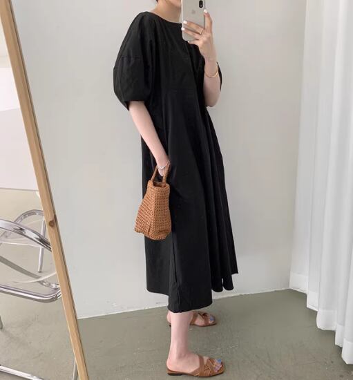 ロングワンピース レディース ワンピース 半袖ワンピース パフスリーブ ボリューム袖 ラウンドネック シンプル 無地 春夏 ゆったり カジュアル お出かけ おしゃれ きれいめ ワンサイズ ファッション
