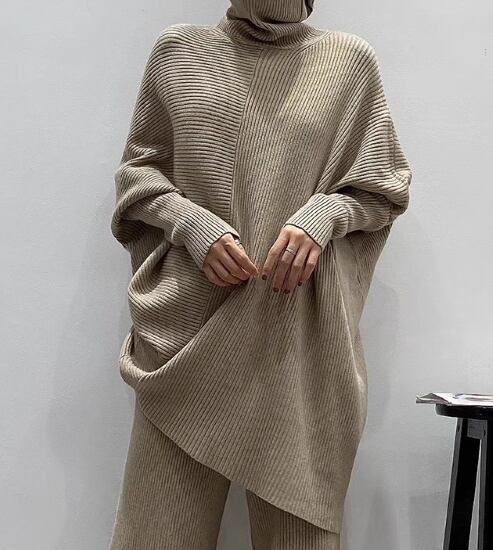 ニットセットアップ レディース 2点セット 上下セット ツーピース シンプル 無地 トップス プルオーバー 長袖 タートルネック セーター ボトムス 長ズボン ワイドパンツ カジュアル お出かけ
