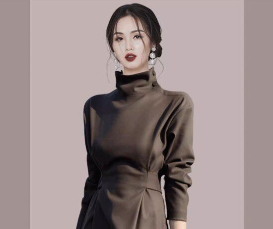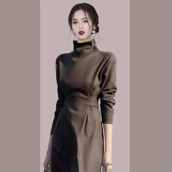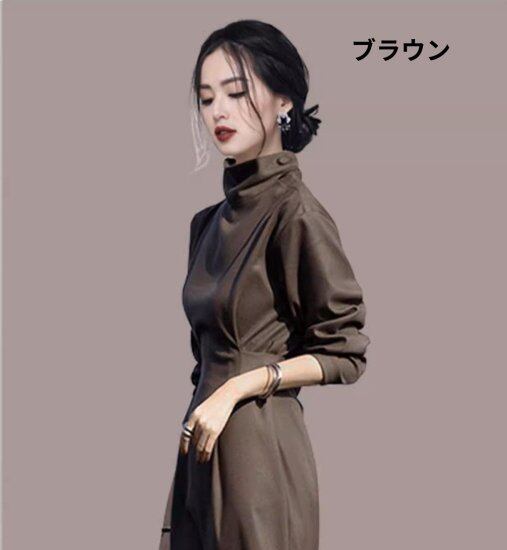 ワンピース レディース ハイネック ロングワンピース ウエストリボン タイトワンピース ロング丈 マキシ丈 ボタン 無地 シンプル ドレス エレガント きれいめ オフィス パーティー おしゃれ