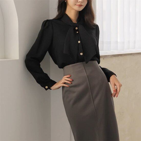 しなやかな質感が上品な印象のボウタイブラウス。