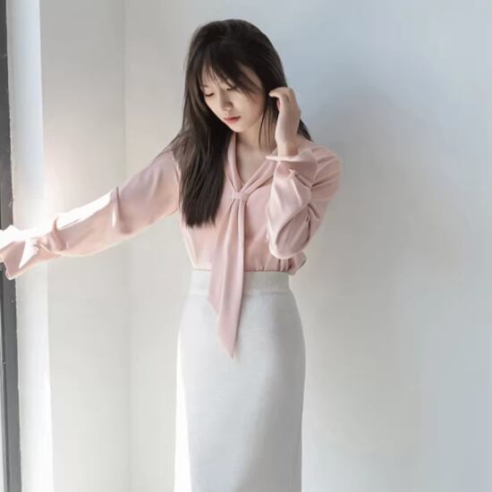 ボウタイブラウス レディース Vネック 長袖 シャツ プルオーバー スカーフ リボン カフス シンプル 無地 リボンタイ フェミニン エレガント 上品 レトロ クラシカル オフィス おしゃれ