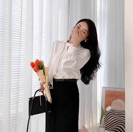 ボウタイがおしゃれなシフォンブラウス。