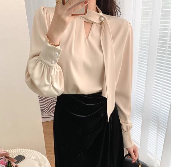 シフォンブラウス レディース トップス シフォンシャツ 長袖ブラウス ボリューム袖 ランタンスリーブ ボウタイ パール装飾 きれいめ エレガント カジュアル お出かけ おしゃれ オフィス お呼ばれ