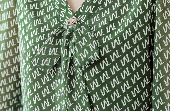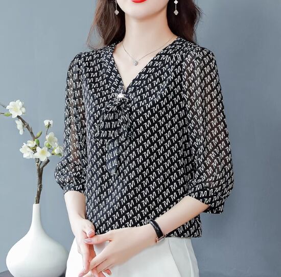 シフォンブラウス レディース トップス シフォンシャツ Vネック リボンタイ 七分袖 総柄 カジュアル お出かけ おしゃれ きれいめ エレガント プルオーバー 大きいサイズ ゆったり オフィス 女性