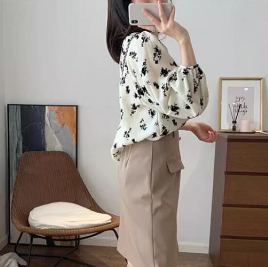 シフォンブラウス レディース トップス シフォンシャツ 長袖 花柄 フラワー フローラル コントラストカラー ランタンスリーブ 女性 カジュアル お出かけ おしゃれ 可愛い ゆったり プルオーバー