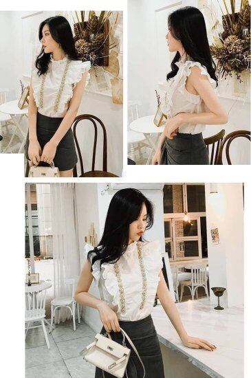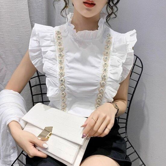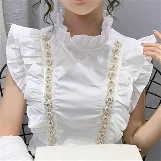 フリルブラウス レディース ノースリーブ フリルネック フリルスリーブ ビジュー フレンチスリーブ スタンドカラー レトロ クラシカル フェミニン エレガント きれいめ ガーリー シャツ おしゃれ