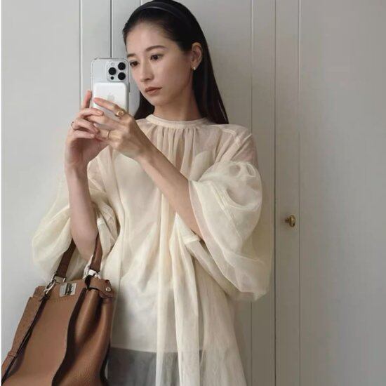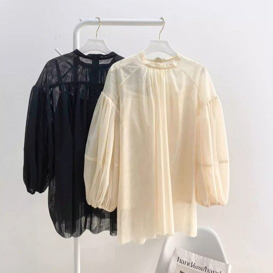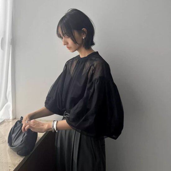 ふんわりボリュームのある袖が大人かわいいシアーブラウス。