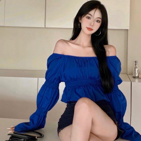 オフショルダーブラウス レディース シャーリング プルオーバー シャツ 長袖 ボリューム袖 スクエアネック ギャザー ショート丈 クロップド丈 レトロ かわいい ガーリー カジュアル おしゃれ