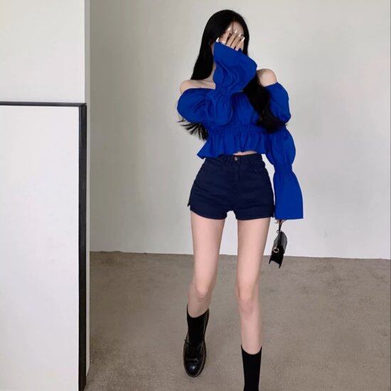 鮮やかなカラーが目を惹くオフショルダートップス。