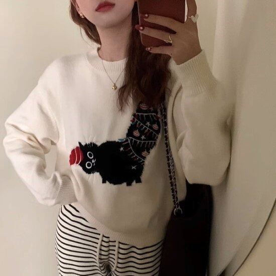 ニットセーター レディース ねこ 長袖 ラウンドネック クルーネック ニット 猫 ネコ cat アニマル ショート丈 かわいい ガーリー cute カジュアル クリスマス 3color おしゃれ