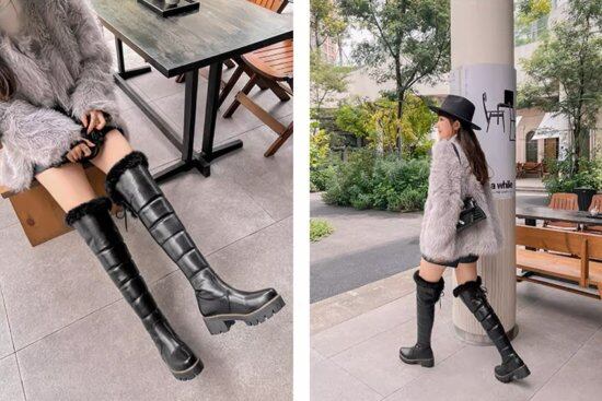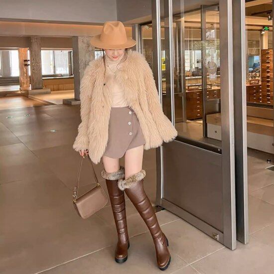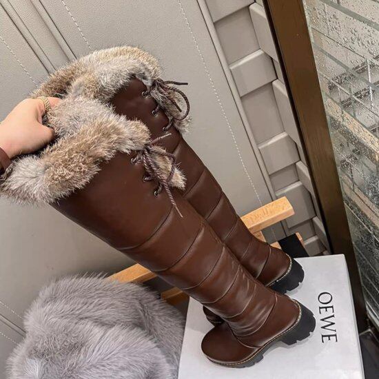 ふわふわのファーが付いたダウン型のロングブーツ。