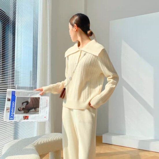 セットアップ レディース ニットスーツ 上下セット セーター プルオーバー ケーブル編み ビックカラー ニットパンツ ワイドパンツ ロング 3color ニットアップ カジュアル きれいめ おしゃれ