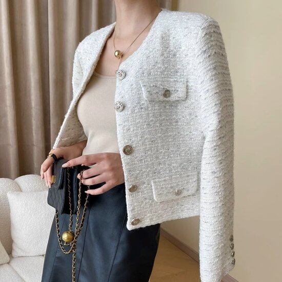 ツイードジャケット レディース ノーカラー 長袖 ボタン ラウンドネック シングルブレスト ショート丈 クロップド丈 きれいめ エレガント 結婚式 披露宴 入学式 卒業式 セレモニー おしゃれ