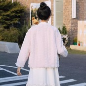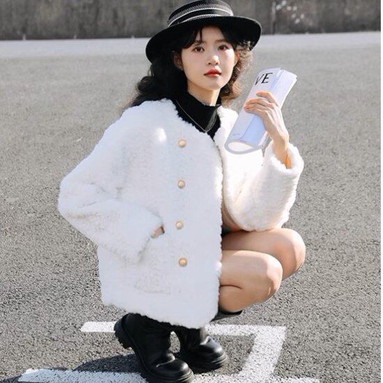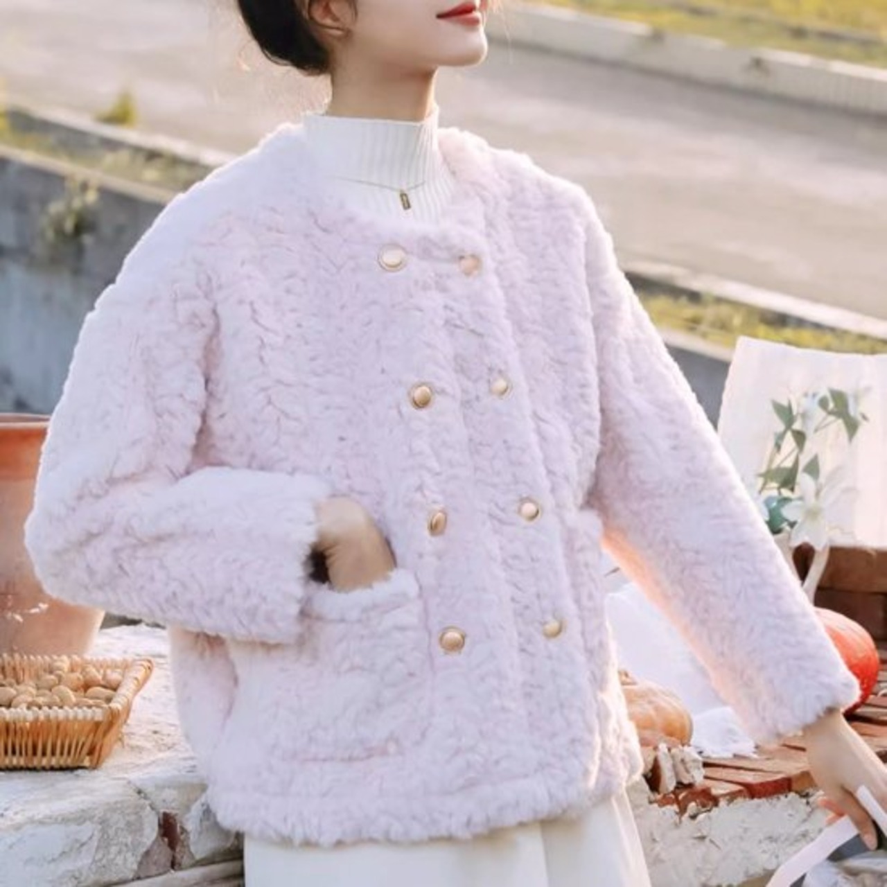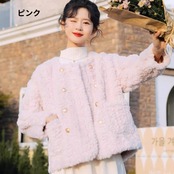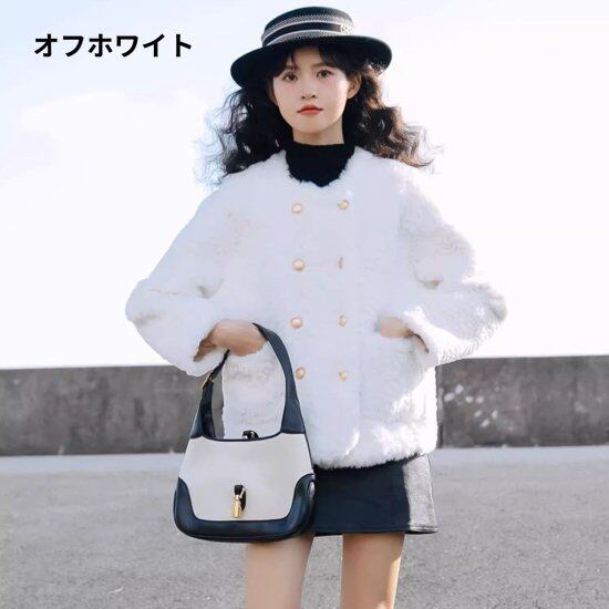 ファージャケット レディース ショートコート 長袖 ラウンドネック ダブルブレスト もこもこ ふわふわ フェイクファー エコファー 2color かわいい フェミニン エレガント コート おしゃれ