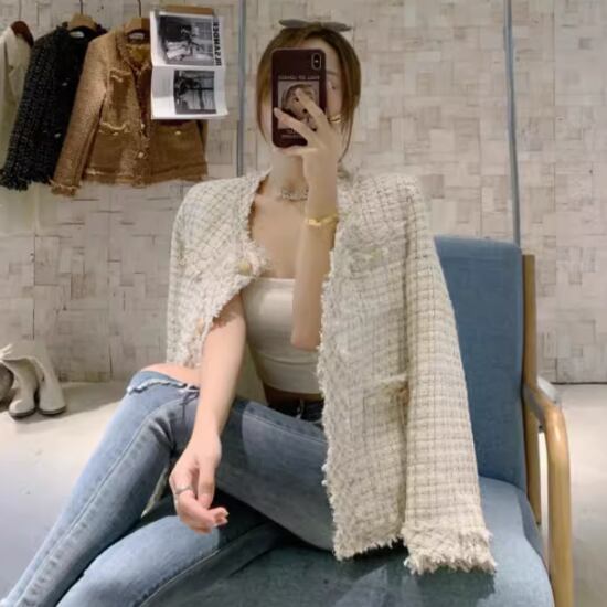 ツイードジャケット レディース アウター 羽織 長袖ジャケット ノーカラージャケット フロントボタン シングルブレスト ポケット フリンジ きれいめ エレガント お出かけ おしゃれ フォーマル 女性