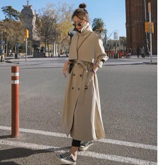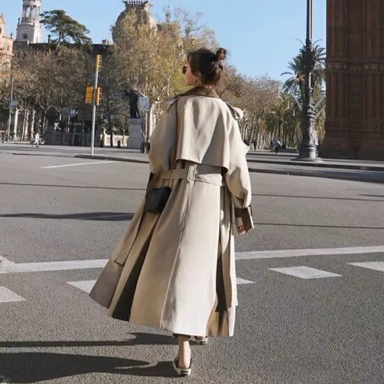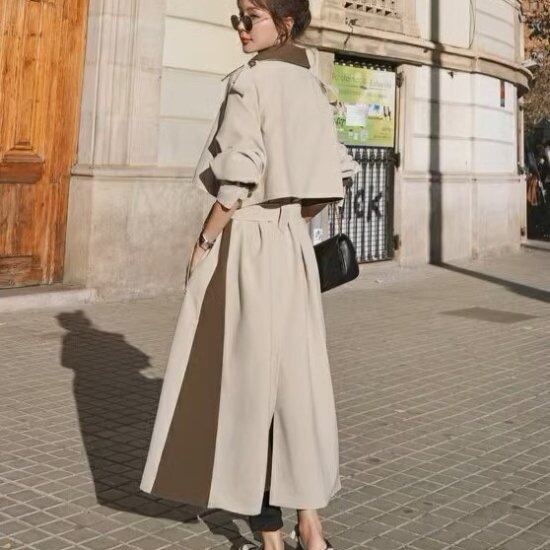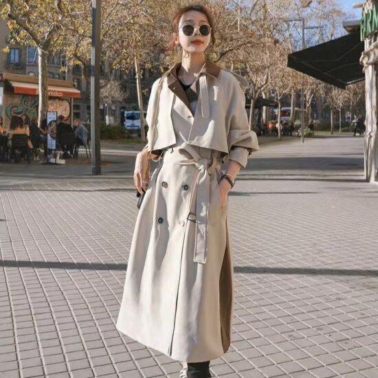 トレンチコート レディース バイカラー ロングコート 配色コート ベルト ダブルブレスト スタンドカラー ロング丈 マキシ丈 きれいめ エレガント カジュアル オフィス おでかけ おしゃれ