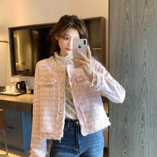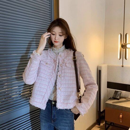 ツイードジャケット レディース ノーカラージャケット 長袖 ラウンドネック フリンジ ショート丈 アウター きれいめ エレガント 上品 2color 入学式 卒業式 セレモニー パーティー おしゃれ