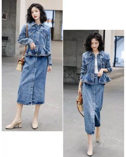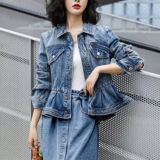 セットアップ レディース デニム 上下セット デニムジャケット 長袖 ペプラム タイトスカート スリット デニムスカート ロング ミモレ きれいめ エレガント カジュアル 個性的 セット おしゃれ