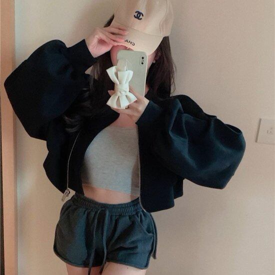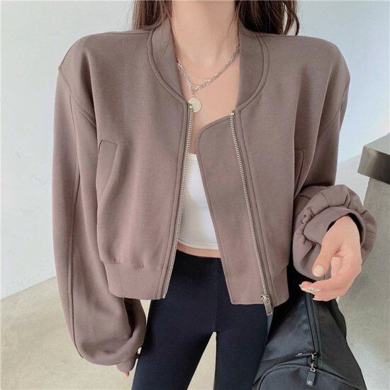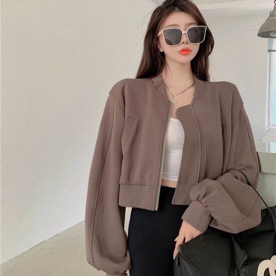 ショートジャケット レディース ブルゾン スウェット 長袖 パフスリーブ ランタンスリーブ ボリューム袖 ショート クロップド ファスナー 2color レトロ カジュアル スポーティー おしゃれ