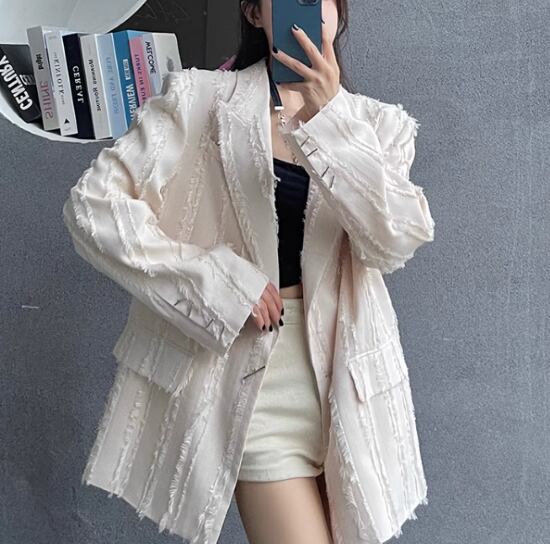 長袖ジャケット レディース アウター 羽織 オーバーサイズジャケット スーツ襟 フリンジ カジュアル お出かけ おしゃれ ルーズ ゆったり スタイリッシュ きれいめ オフィス 通勤 ブラック ホワイト