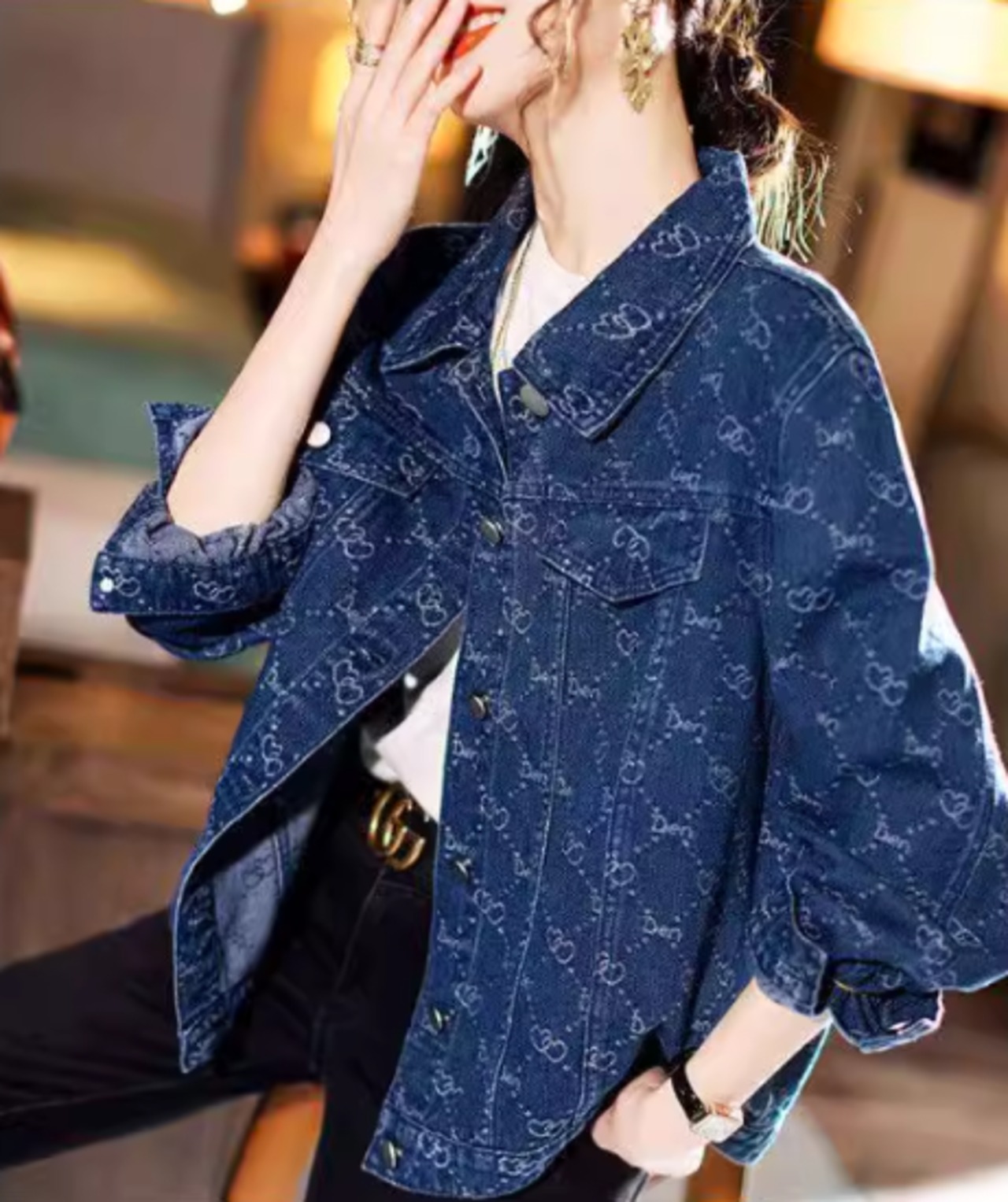 デニムジャケット レディース アウター 羽織 長袖ジャケット Gジャン フロントボタン ハート柄 総柄 可愛い キュート 襟あり ポロ襟 ゆったり ルーズ カジュアル お出かけ おしゃれ 春夏 上着