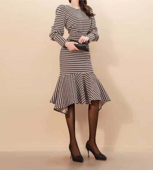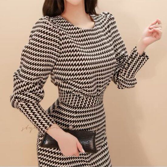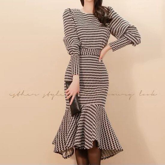 セットアップ レディース ツーピース 千鳥格子 マーメイド 長袖 パフスリーブ プルオーバー ミモレ丈 スカート エレガント 上品 フリル セレモニー 入学式 卒業式 入園式 卒園式 おしゃれ