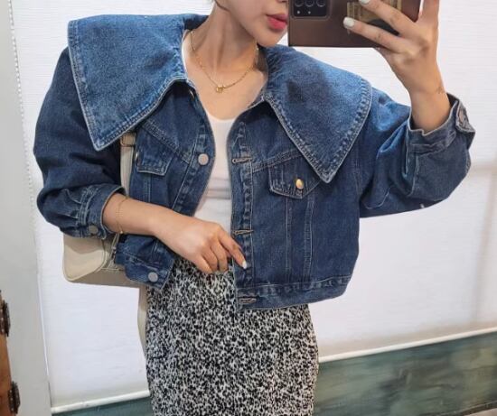 デニムジャケット レディース アウター 羽織 上着 長袖ジャケット ショート丈ジャケット 大きめ襟 ドールカラー フロントボタン カジュアル お出かけ おしゃれ きれいめ 個性的 春夏 ファッション