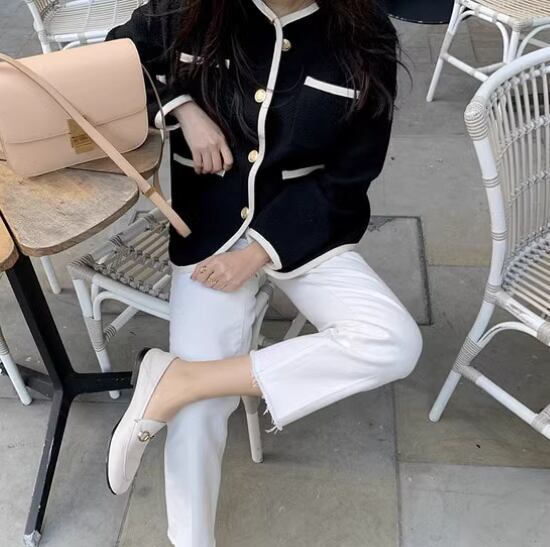 コントラストカラーにゴールドボタンがおしゃれなジャケット。