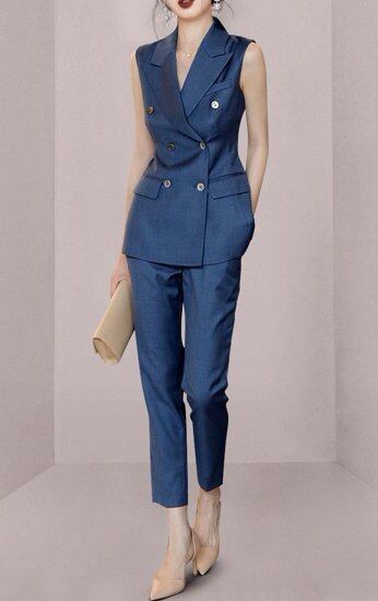 スタイリッシュなノースリーブのパンツスーツ。