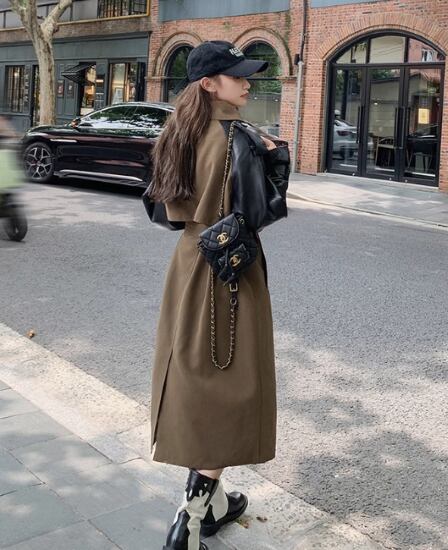 定番のトレンチコートも袖の切り替えデザインで個性的なおしゃれアイテムに。