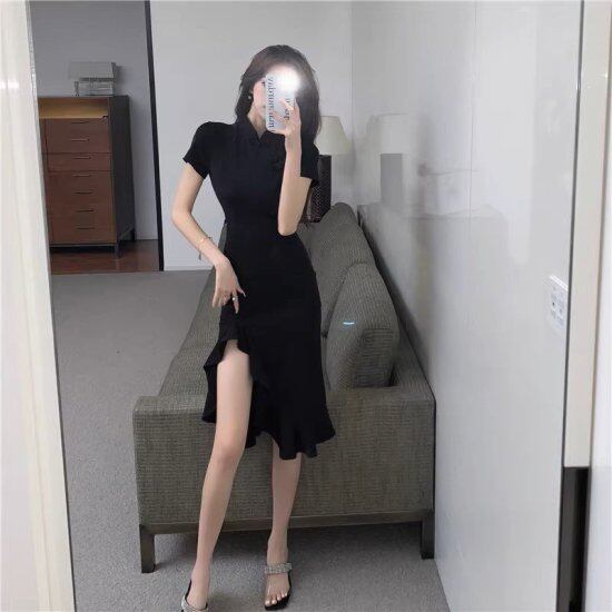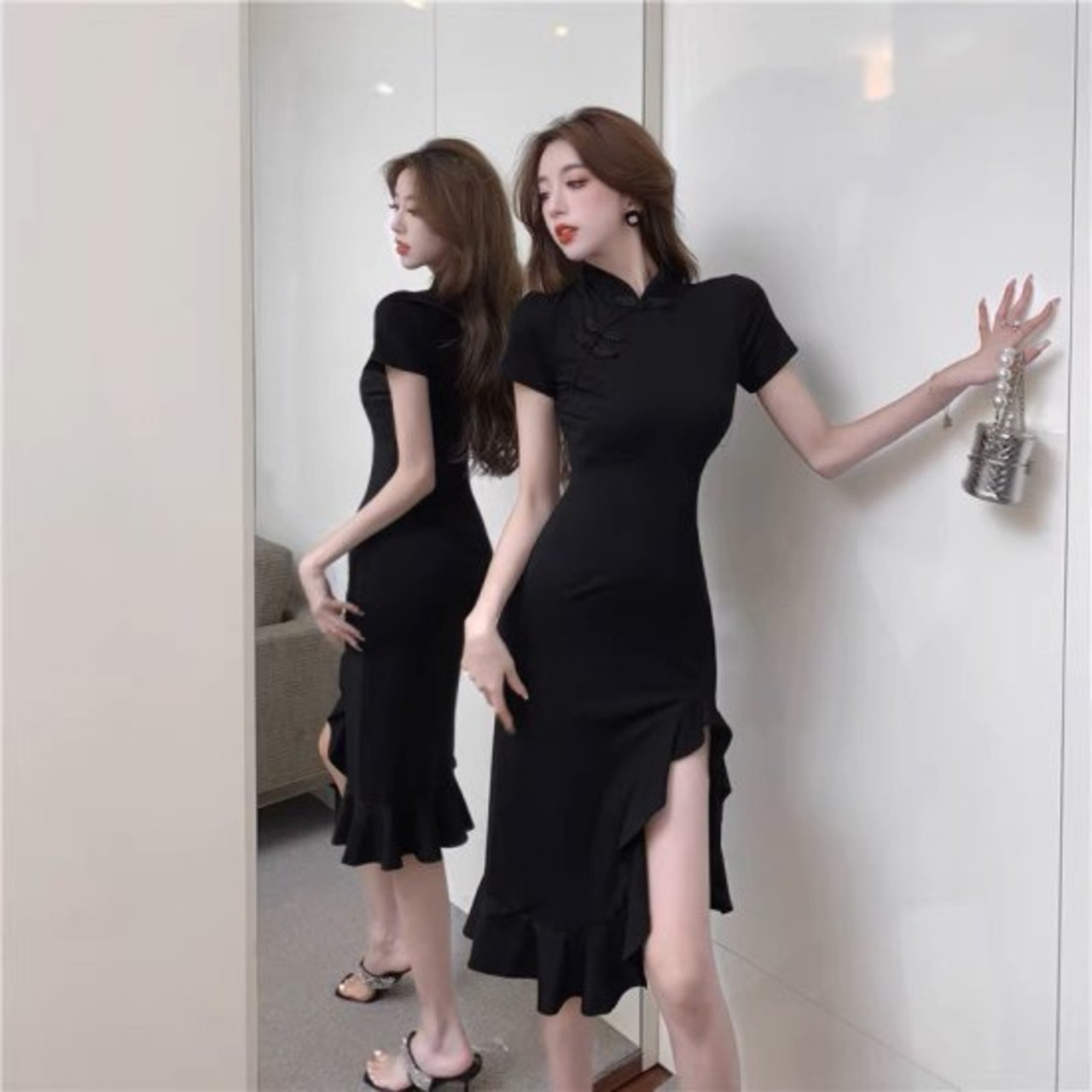 半袖ワンピース レディース チャイナドレス風 スタンドカラー スリット ミモレ丈 ロング丈 スリム タイト ロングワンピース フリル 黒 セクシー エレガント アジアン パーティー おしゃれ
