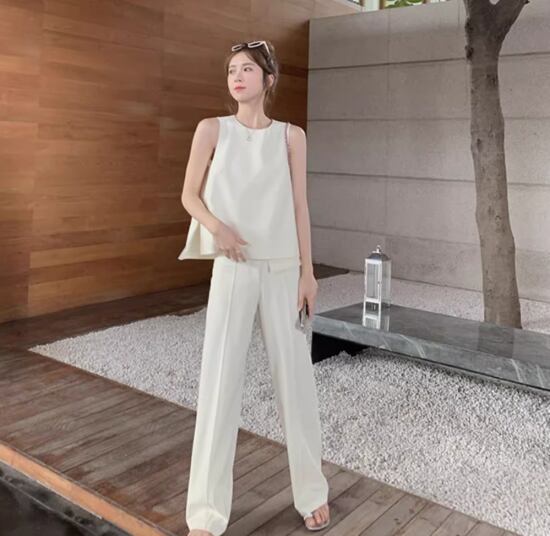 セットアップ レディース 2点セット ツーピース 上下セット トップス ノースリーブ ラウンドネック サイドスリット ボトムス 長ズボン シンプル 無地 春夏 カジュアル お出かけ おしゃれ ゆったり