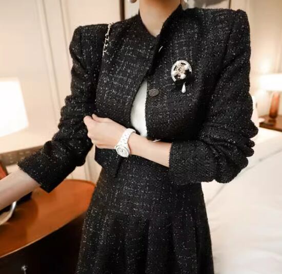 ショート丈ジャケットとハイウエストスカートの上品セットアップ。