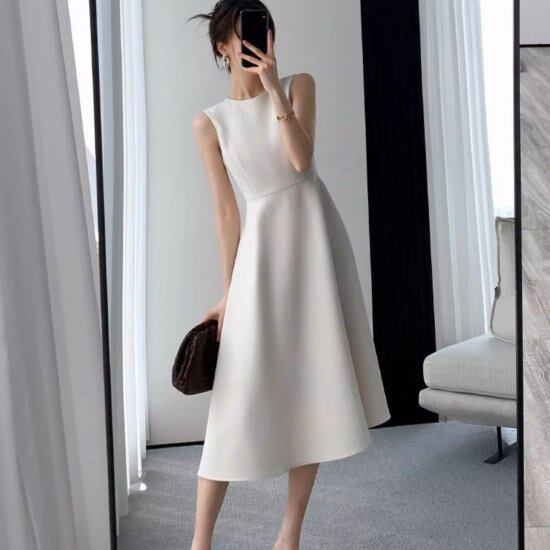 シンプルなAラインのノースリーブワンピース。