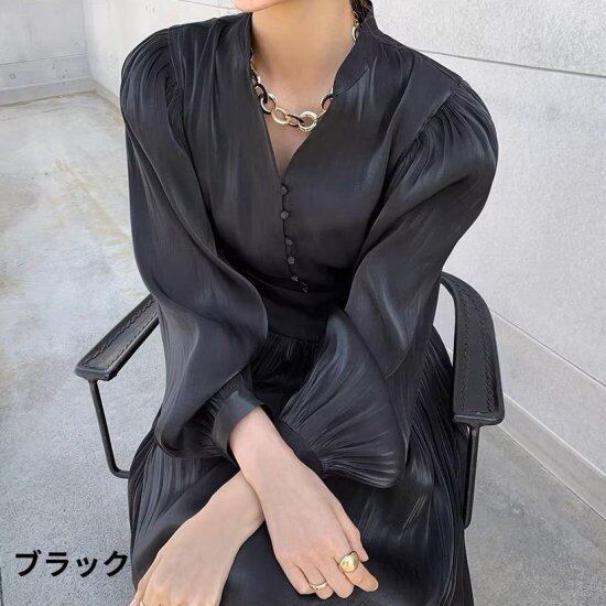 ロングワンピース レディース プリーツワンピース 長袖 ボリューム袖 サテン調 光沢 Vネック 上品 きれいめ エレガント レトロ クラシカル 3color 入学式 卒業式 入園式 卒園式 おしゃれ
