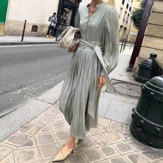細かなプリーツがエレガントなシルエットを演出するワンピースドレス。