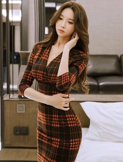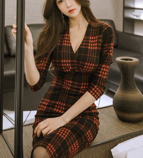 タイトワンピース レディース チェック柄 Vネックワンピース 長袖 七分袖 カシュクール ハイウエスト スリム タイト レトロ クラシカル きれいめ セクシー エレガント オフィス おしゃれ