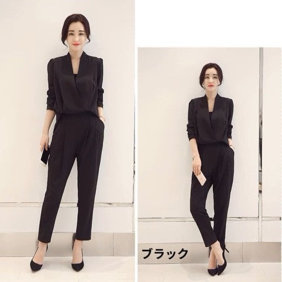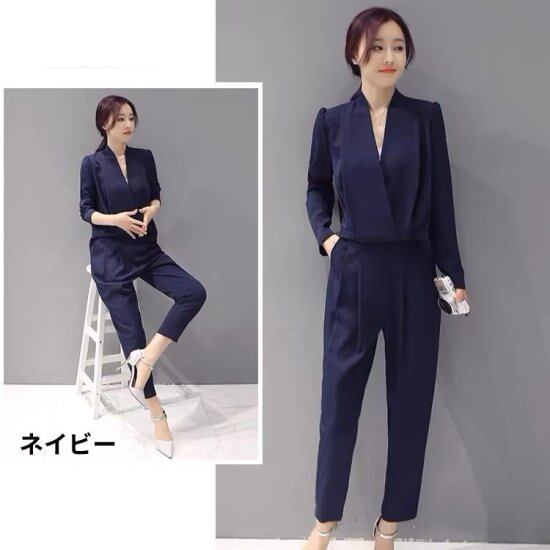 セットアップ レディース オールインワン Vネック 長袖 ブラウス プルオーバー タック クロップドパンツ 上下セット スーツ 3color セレモニー 入学式 卒業式 入園式 卒園式 おしゃれ
