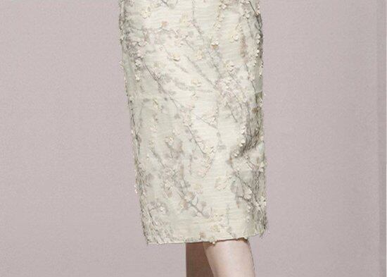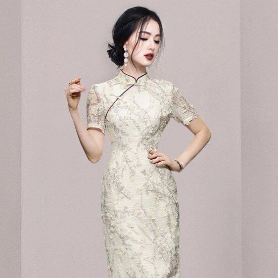 半袖ワンピース レディース チャイナドレス スタンドカラー 花 スリム タイトワンピース フラワーモチーフ 立体的 シアー レトロ クラシカル 2color きれいめ エレガント おしゃれ
