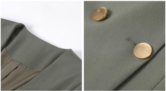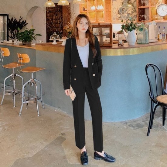 女性らしい柔らさを演出するノーカラージャケットのセットアップ。