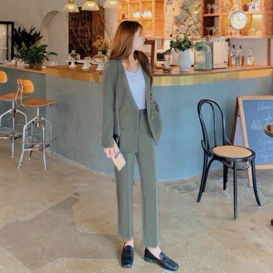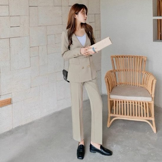 セットアップ レディース パンツスーツ ノーカラージャケット 長袖 ダブルブレスト ストレートパンツ センタープレス 3color きれいめ 上品 オフィス 入学式 卒業式 入園式 卒園式 おしゃれ