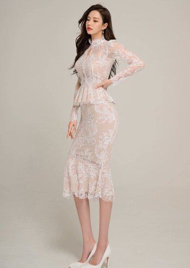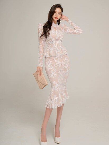 セットアップ レディース パーティードレス レース ツーピース 上下セット ブラウス プルオーバー ペプラム マーメイド タイト レーススカート 総レース エレガント 結婚式 謝恩会 おしゃれ