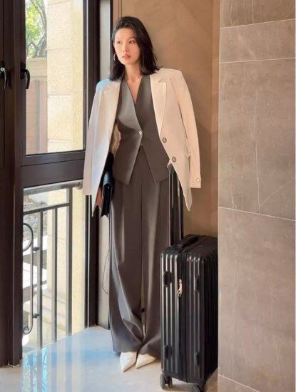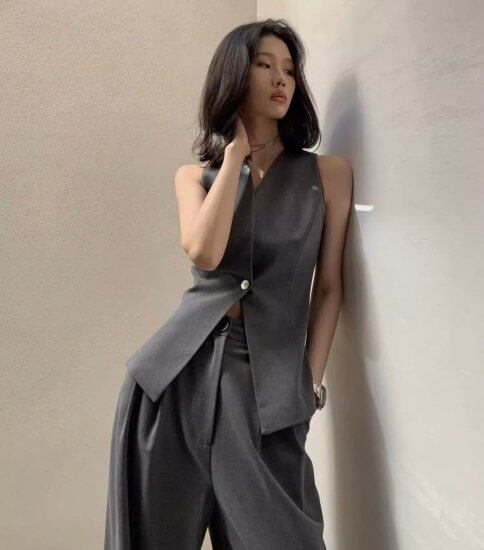 スタイリッシュなベストとワイドパンツのセットアップ。