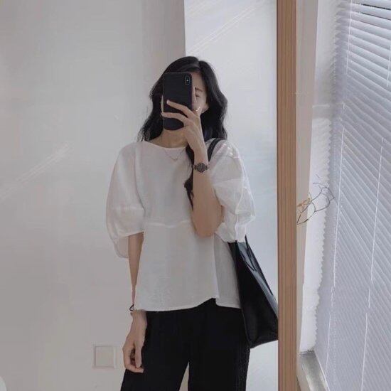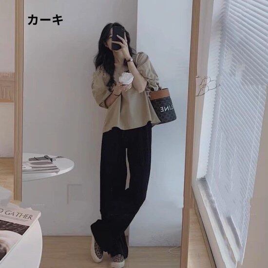 半袖ブラウス レディース パフスリーブ シャツ ラウンドネック ボリューム袖 プルオーバー ゆったり オーバーサイズ ルーズ 3color かわいい カジュアル ナチュラル 無地 ブラウス おしゃれ